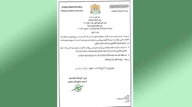 ٣ـ منعه من دخول المنشآت الرياضية والملاعب والأندية والصالات التابعة لوزارة الرياضة والشباب، وعدم تكليفه بأي مهمة رياضية أو إدارية أو أي عمل يتبع للوزارة.