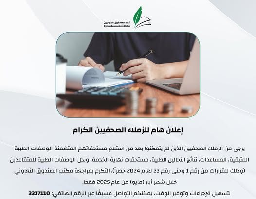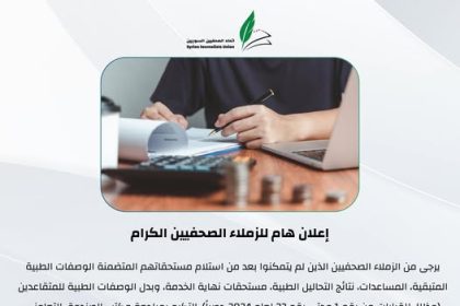 إعلان هام من اتحاد الصحفيين ابتداءً من يوم الأحد الموافق 6 يوليو 2025، يفتح اتحاد الصحفيين باب تثبيت القيد في جداوله والتسجيل للحصول على البطاقة الصحفية.