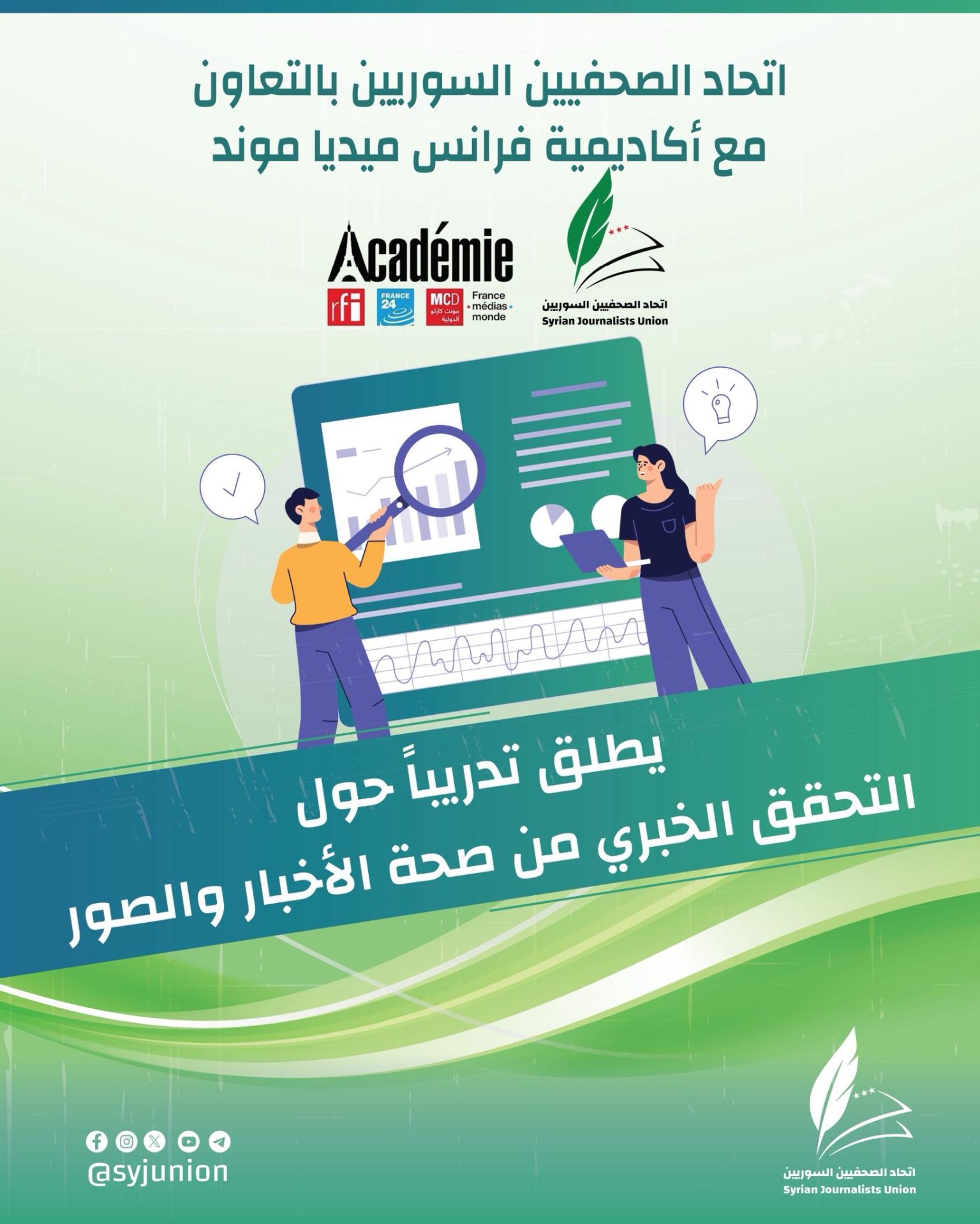 اتحاد الصحفيين السوريين بالتعاون مع أكاديمية فرانس ميديا موند، يطلق تدريباً حول التحقق الخبري من صحة الأخبار والصور، فعلى الراغبين بالتسجيل تعبئة الرابط المرفق.