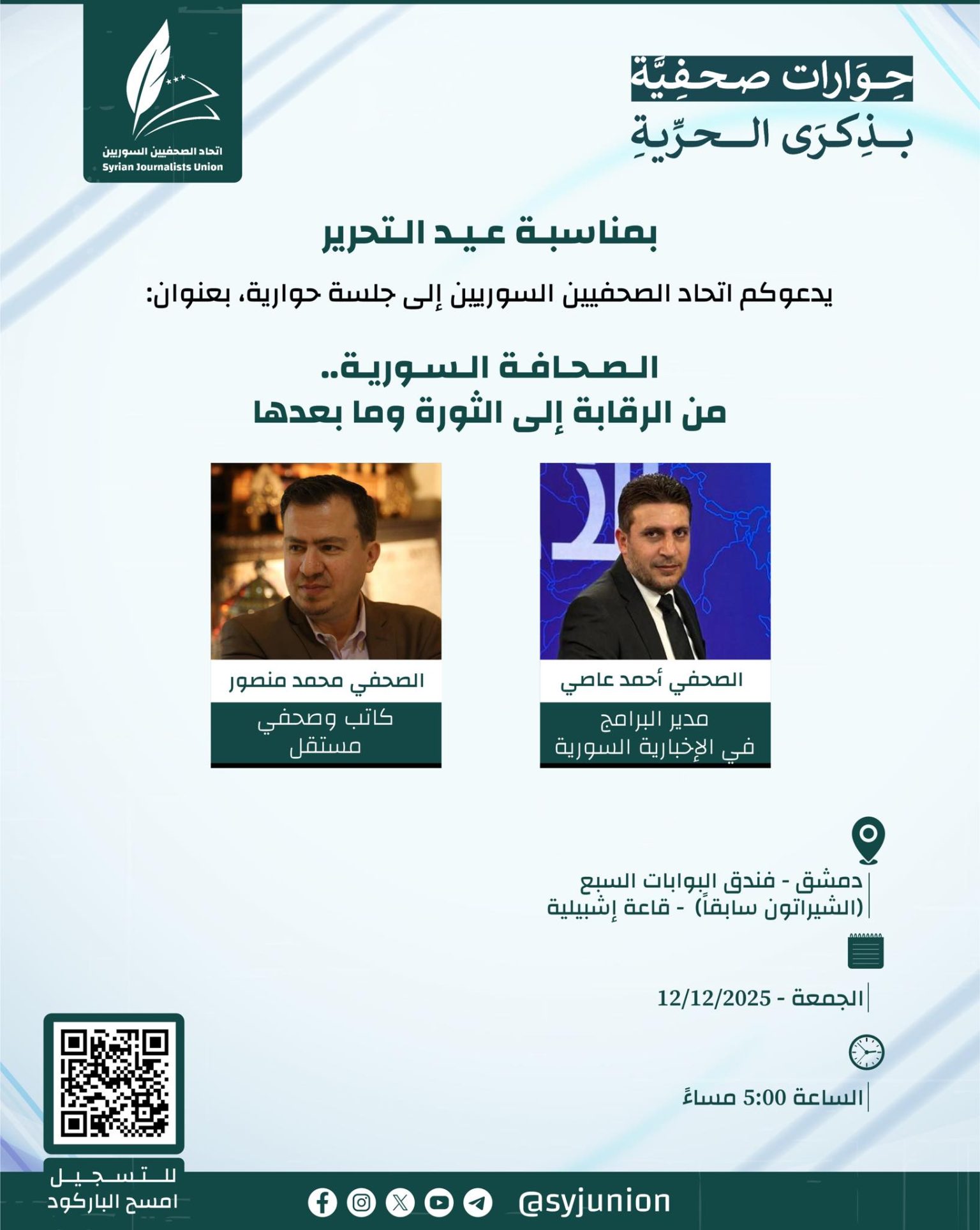 حوارات صحفية حوارات صحفية بذكرى الحرية آخر تحديث: 2025-12-14 2:47 م نشر في: 2025-12-08 شارك شارك يدعوكم اتحاد الصحفيين السوريين لحضور الجلسة الثانية من فعالية “حوارات صحفية بذكرى الحرية” والتي ستعقد تحت عنوان “الصحافة السورية.. من الرقابة إلى الثورة وما بعدها” رابط التسجيل: https://forms.gle/hKTEhcfjSuvnbzhF9 #اتحاد_الصحفيين_السوريين #لنكمل_الحكاية شارك: Facebook Whatsapp Whatsapp Telegram انسخ الرابط Print شارك المقال السابق بيان صادر عن اتحاد الصحفيين السوريين بمناسبة عيد التحرير المقال القادم حوارات صحفية بذكرى الحرية آخر الاخبار الصحافة السورية.. من الرقابة إلى الثورة وما بعدها، عنوان الجلسة الثانية من فعالية حوارات صحفية بذكرى الحرية التي نظمها اتحاد الصحفيين السوريين في دمشق أخبار الاتحاد من الشاهد إلى المراسل.. أخبار الاتحاد عقد فرع اتحاد الصحفيين السوريين في إدلب اجتماعه الأول بحضور أعضائه ورئيس الاتحاد أخبار الاتحاد ام فرع اتحاد الصحفيين السوريين في حلب يوماً تفاعليّاً مع أعضاء الاتحاد في المحافظة أخبار الاتحاد التواصل الاجتماعي248.1kLike69.1kFollow134kPin54.3kFollow