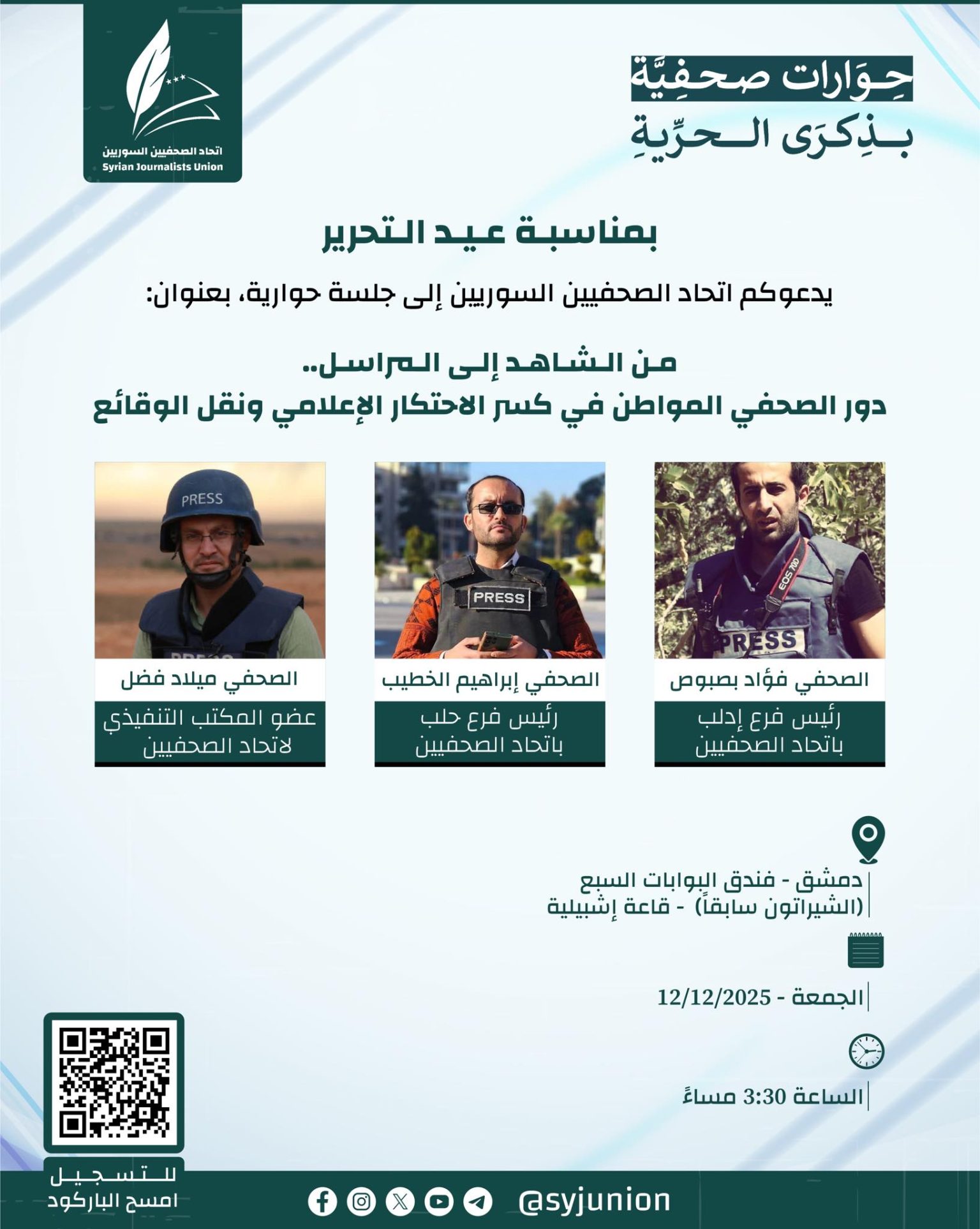 يدعوكم اتحاد الصحفيين السوريين لحضور الجلسة الأولى من فعالية “حوارات صحفية بذكرى الحرية” والتي ستعقد تحت عنوان “من الشاهد إلى المراسل.. دور الصحفي المواطن في كسر الاحتكار الإعلامي ونقل الوقائع”